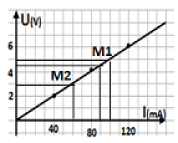 3) La valeur de la résistance R de ce résistor est : \(R=\frac{∆U}{∆I}=\ \frac{U(M_1)-U(M_2)}{I(M_1)-I(M_2)}\)= A.N : R = \(\frac{5-3}{0,1-0,06}\)= 50 Ω.