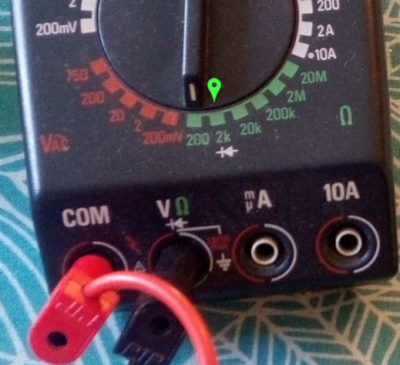 Mesure directe avec un ohmmètre : un multimètre, utilisé en ohmmètre, permet de connaitre directement la valeur d’une résistance. Il suffit d'insérer le résistor entre les bornes de l'ohmmètre, le commutateur étant placé sur la position Ω comme l’indique la photo ci-contre.