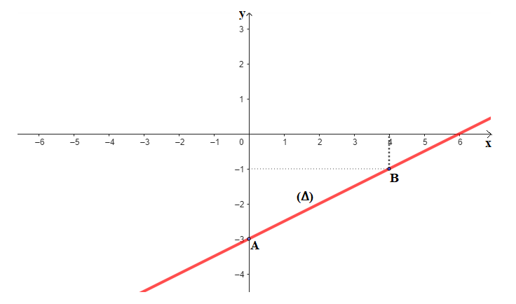 Dans le plan muni d’un repère \((O, I, J)\), trace la droite \(\left( \Delta \right)\), représentation graphique de l’application affine \(𝑓 \)définie par : \(𝑓(𝑥) = 0,5𝑥 − 3\).