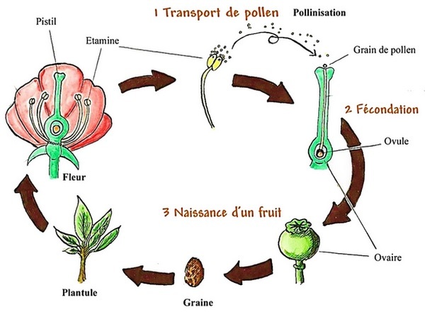 Le grain de pollen germe sur le stigmate de la fleur en émettant un long tube pollinique dans lequel s'engagent les deux gamètes ou anthérozoïdes qu'il contient. L'un d'eux fusionne avec le noyau de l'ovule et donne l'embryon. A l'issue de ce processus, l'ovule fécondé se transforme en graine, l'ovaire se transforme en fruit, les sépales et les pétales régressent progressivement. A l'instar des grains de pollen, les fruits mûrs se détachent de la plante-mère et sont à leur tour transportés soit par les animaux, soit par le vent. La germination des graines dans des conditions favorables redonne une nouvelle plante et le cycle recommence.