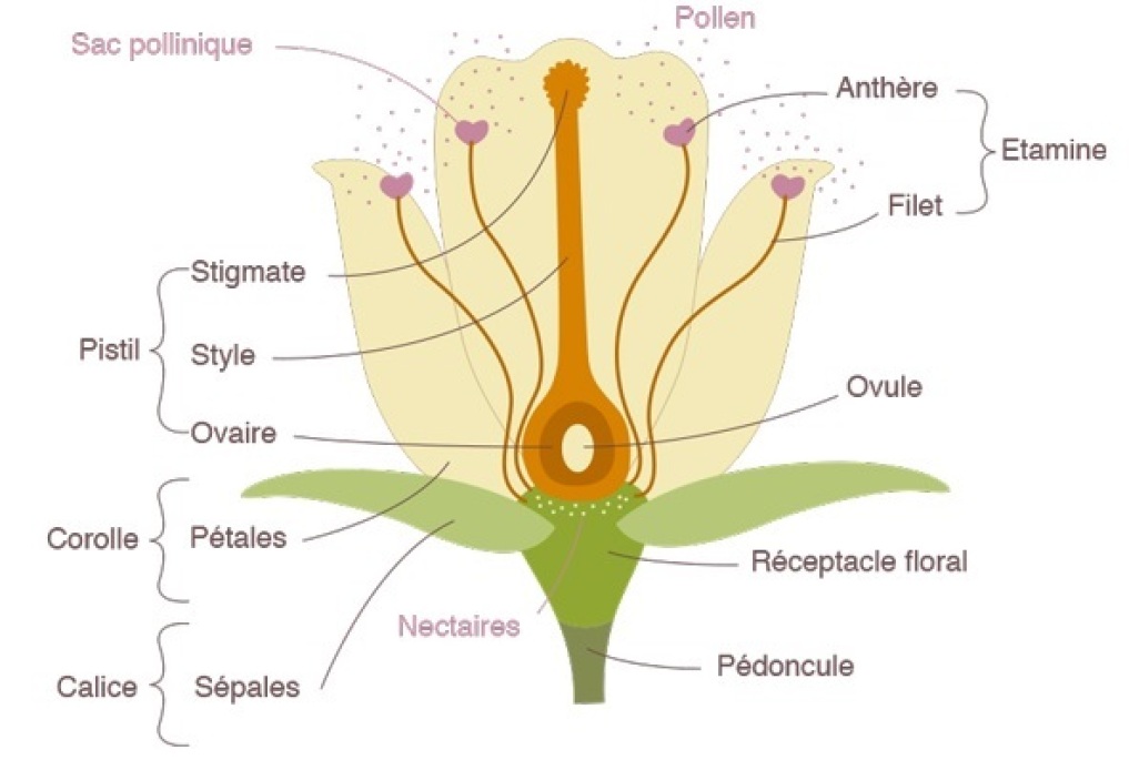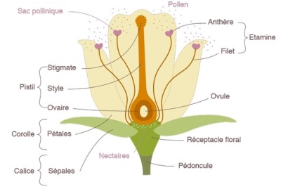 Le pistil contient à sa base l'ovaire qui abrite les ovules et qui se prolonge par un tube appelé style ayant une extrémité élargie appelée stigmate.