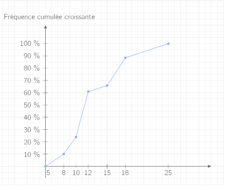 On donne la série statistique suivante. Nous voulons construire le diagramme (polygone) des fréquences cumulées croissantes.