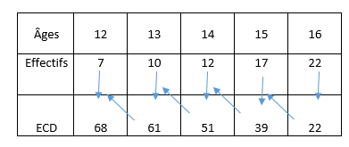 La série étant ordonnée, l'effectif cumulé décroissant (ECD) d'une modalité est la somme des effectifs des modalités supérieures ou égales à cette modalité.