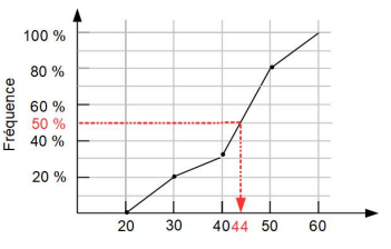 On lit sur le graphique, ci-dessous, que environs \(50\%\)des employés ont moins de \(44\) \(ans\). L’âge médian est donc environ \(44\)