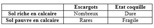 D'après ce tableau, on constate que les escargots sont plus nombreux dans les sols riche en calcaire et leur coquille est dure alors qu'en sol pauvre en calcaire, ils sont rares et leur coquille est fragile. Donc, on en déduit que les escargots préfèrent les sols riches en calcaire.