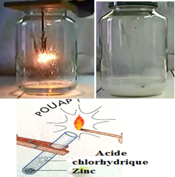 Lorsque l'acide chlorhydrique attaque le zinc, il se produit du dihydrogène et un dégagement de chaleur. D'autres expériences montrent la formation aussi du chlorure de zinc.