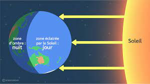 Chaque point du jour passe de la zone éclairée, exposée aux rayons solaires et où règne le jour, à la zone d’ombre opposée au soleil et où règne la nuit. C’est ainsi que se succèdent les jours et les nuits.