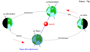 Quatre situations rythment la translation de la terre : les deux solstices et les deux équinoxes. En effet, deux fois par an, le cercle d’illumination, c’est-à-dire le cercle qui sépare la terre en deux moitiés (l’une à l’ombre, l’autre au soleil) passe par les deux pôles. Sur toute la terre, sauf aux pôles, le jour et la nuit ont la même durée ; c’est le temps des équinoxes. Deux fois par an, au contraire, l’inégalité des jours et des nuits est à son maximum : c’est le temps des solstices.