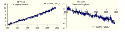 Le document en vis à vis représente les images de tracés de déplacement d'une plaque lithosphérique où se situe Reykjavik en Islande. Les images montrent les résultats obtenus, à l'aide de données GPS, avec les fichiers traités dans Excel pour la latitude et la longitude.
