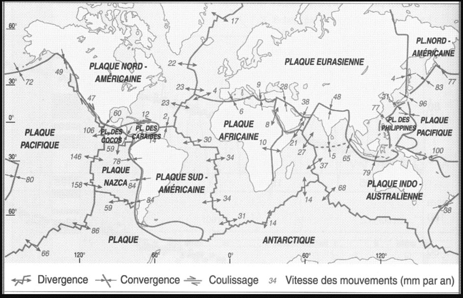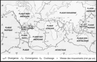 Les mouvements relatifs des plaques entre elles sont des rotations qui définissent 3 types de mouvements, mais 4 types de frontières de plaques : mouvement de divergence (dorsales océaniques), mouvement de convergence (subductions et collisions) et mouvement de coulissage (failles transformantes).