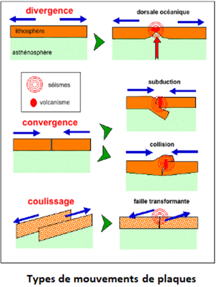 Les plaques tectoniques peuvent bouger de manières différentes : convergence (subduction et collision) ; divergence.