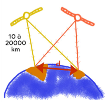 Le GPS (Global Positioning System) est un système de géodésie spatiale permettant le positionnement d’un grand nombre de sites mondiaux en trois dimensions (latitude, longitude, altitude) ainsi que la mesure du temps. La technique du GPS permet actuellement de mesurer le déplacement des plaques lithosphériques au millimètre près, grâce aux satellites qui déterminent la position exacte de différents points à différents moments. Les plaques se déplacent de quelques centimètres par an. Ce système GPS repose sur l’utilisation de trente satellites à altitude constante autour de la Terre. Les satellites GPS sont entre 10 et 20 000 kilomètres d’altitude au-dessus de nous. Voici un schéma qui représente les mesures réalisées par satellite :