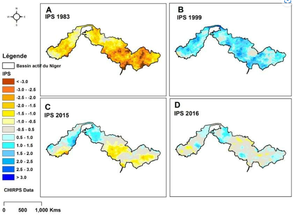 Le document ci-contre montre la répartition spatiale de l'indice pluviométrique standardisé (IPS) pour une année très sèche 1983 (A), une année très humide 1999 (B) et deux années les plus récentes de pluviométrie modérément déficitaire 2015 (C) et modérément excédentaire 2016 (D) sur le bassin actif du Niger.