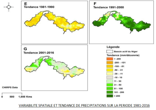 Fais une analyse de la variabilité spatiale de la tendance de pluie dans le bassin du Niger durant les trois décennies.