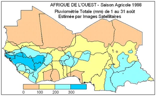 La carte ci-dessous indique la pluviométrie totale pour le mois d'août 1998. Les données ont été extraites à partir des estimations des pluies (RFE) par images satellitaires préparées par le projet NOAA/USGS/FEWS/USAID. Les images de pluies estimées sont créées par interpolation spatiale de plusieurs paramètres relevés au sol et mesurés par télédétection tels que pluviométrie, humidité relative, vitesse du vent, altitude, températures des nuages à sommet froid.