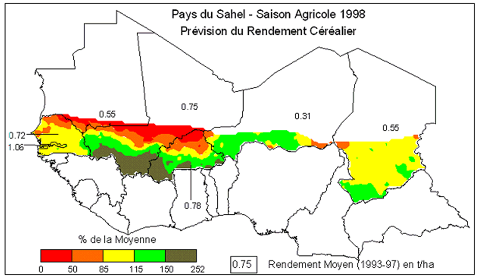 La carte ci-dessous montre la prévision du rendement céréalier (mil, maïs, sorgho) dans le Sahel pour la saison agricole 1998, indiquée en pourcentage du rendement moyen des 5 dernières années (1993-1997). La carte est obtenue en utilisant pour chaque pays une fonction du rendement qui met en relation, d'une façon statistique pour la période 1982-97, les données de sorties du modèle FAO de bilan hydrique pour une culture donnée au rendement de la culture. Pour l'année 1998, le modèle de bilan hydrique utilise la pluviométrie moyenne à partir du 1er septembre jusqu'à la fin du cycle cultural.