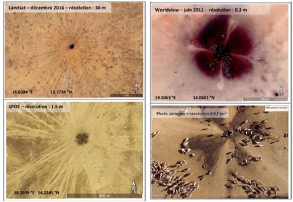 Le document en vis à vis est une visualisation de puits pastoraux d'une même zone au Tchad sur trois images satellites de résolution croissante et une photo aérienne.