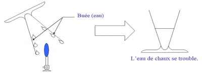 Observation : des gouttelettes d’eau se forment sur les parois internes du verre à pied et l’eau de chaux devient trouble.