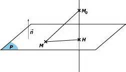 Le vecteur \(\vec n\) de coordonnées \((a ,b, c )\) est normal au plan \(P\) , \(H\) étant le projeté orthogonal de \(M_0\)sur le plan \(P\) on a alors \((M_0H)\) qui est perpendiculaire à \(P\).