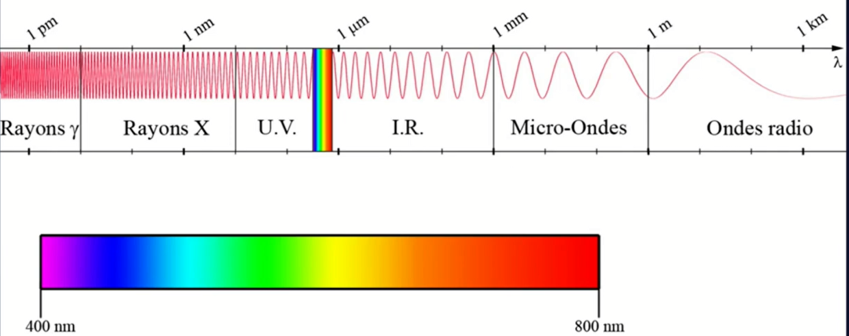 La lumière peut être à la fois décrite comme une onde électromagnétique caractérisée par sa longueur d'onde \(\lambda = \frac{c}{\nu}\) responsable de sa couleur ou comme une particule (petit grain de lumière de masse et de charge nulles appelée photon) véhiculant l'énergie \(E = h\nu\) : c'est la dualité onde-corpuscule. Celle-ci est une formulation qui s'applique aux manifestations du photon, qui se comporte soit comme une onde, soit comme une particule, selon le contexte expérimental considéré.
