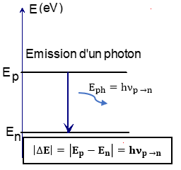 En 1913 Niels Bohr(1885-1962) fait l'hypothèse que l'énergie d'un atome est quantifiée. Celle-ci ne peut prendre que certaines valeurs auxquelles on associe des niveaux d'énergie encore appelés états, notés \(E_n\). Les échanges d'énergie entre la lumière (photon) et la matière (atome) s'interprètent par des transitions électroniques entre les niveaux d'énergie des atomes conduisant à l'absorption ou l'émission de photons. La variation d'énergie\(\Delta{E}\) de l'atome est telle que : \(\Delta{E} = E_{finale} - E_{initiale}\). Si \(\Delta{E} \gt 0\), l'atome gagne de l'énergie (absorption quantique) ; si \(\Delta{E} \lt 0\), l'atome perd de l'énergie (émission quantique).