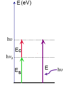 Lorsque l'électron reçoit un photon d'énergie \(E\) supérieure à l'énergie seuil \(E_s\), il est extrait du métal et le surplus lui est transféré sous forme d'énergie cinétique \(Ec\).