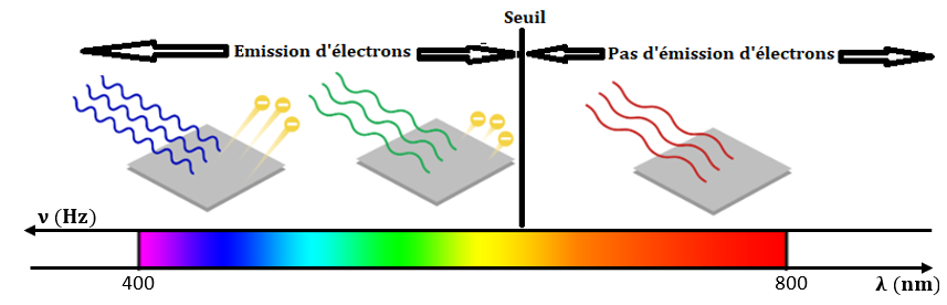 Ainsi, on dira que le phénomène d'effet photoélectrique s'observe si et seulement si la fréquence \(\nu\)de la lumière monochromatique incidente est supérieure ou égale à une fréquence seuil (\(\nu_s\)) qui dépend de la nature du matériau éclairé.