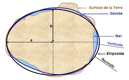 La terre n'est pas une sphère, qui est une forme géométrique dite parfaite, mais un géoïde. Ce terme désigne la forme réelle de la surface terrestre, légèrement aplatie aux pôles et bosselée selon les continents. Son apparence sphérique lorsqu'on l'observe depuis l'espace masque les nombreuses petites irrégularités de sa surface. Pour modéliser cette surface, on utilise une figure géométrique plus régulière, l'ellipsoïde : volume globalement sphérique présentant un aplatissement aux pôles et servant de référence pour la construction des projections cartographiques.