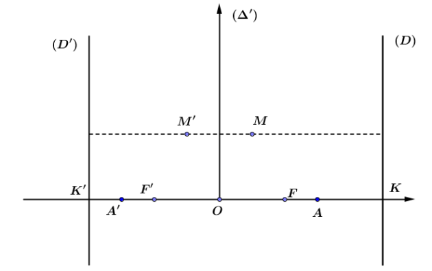 𝐹′ est un point de l’axe focal (∆) et (𝐷′) est une droite perpendiculaire à (∆) en 𝐾′ = S(∆′)(𝐾).