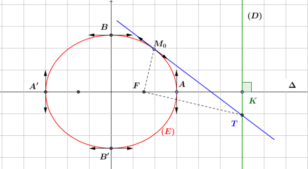 On appelle extérieur de l'ellipse (𝚪) l’ensemble des points 𝑴 du plan P tels que : \(\frac {MF}{MH}\gt e\)