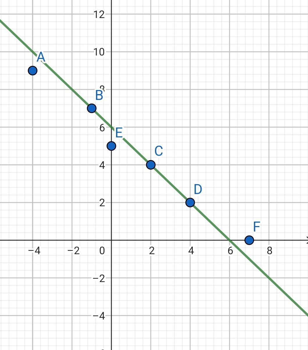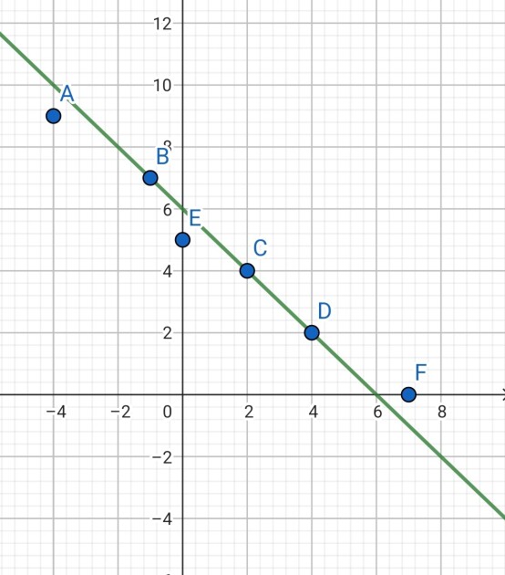 \(A(-4; 9)\) ; \(B(-1; 7)\) ;\(C(2; 4)\) ; \(D(4; 2)\) ; \(E(0; 5)\) ; \(F(7; 0)\).