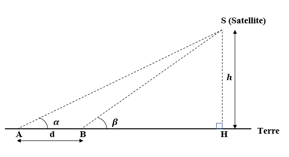 Un satellite en orbite basse S, se trouvant à une distance SH=h de la terre , repère deux points A et B de la terre distants de d km et obtient les mesures des angles \(\alpha\) et \(\beta\). Les points \(A,B\) et \(H\) sont supposés alignés.